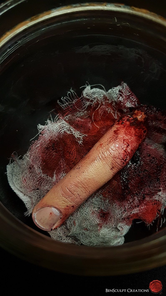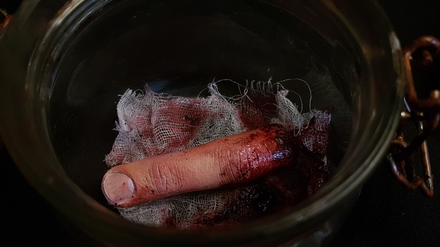 Vieux bocal rouillé contenant un doigt humain coupé.