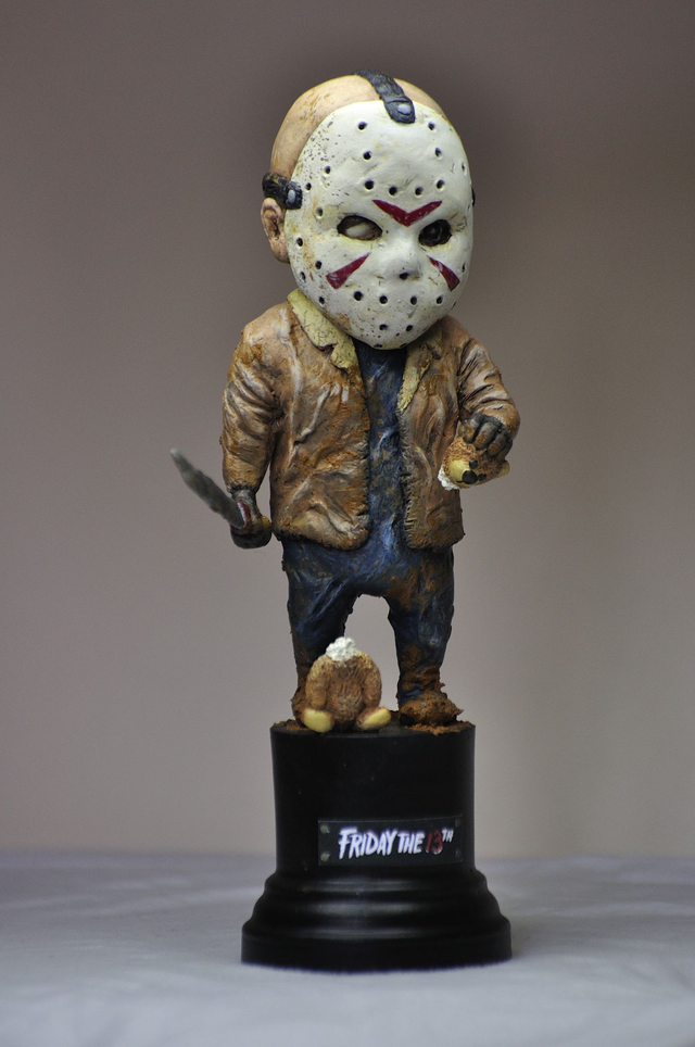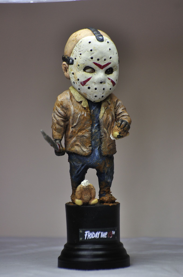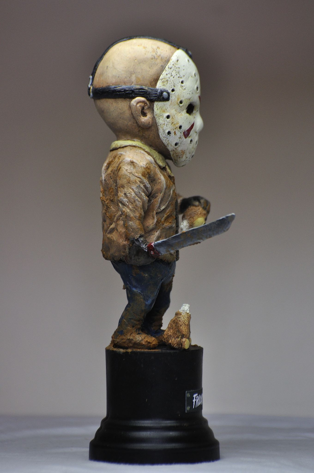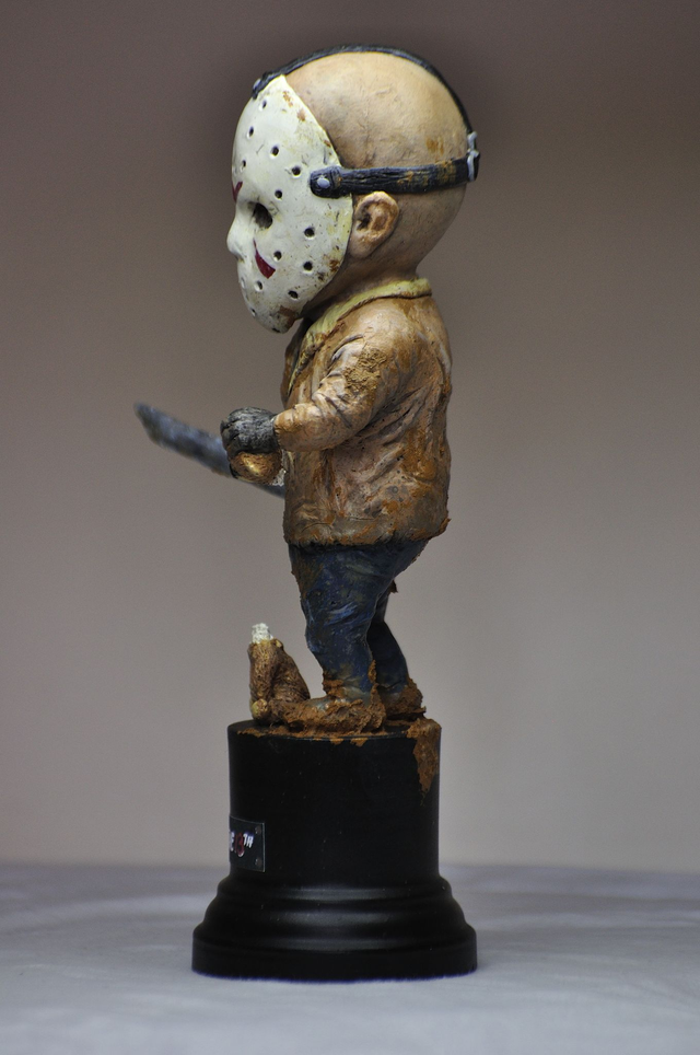 Statue de "Baby Jason Voorhees" représente le célèbre tueur du film slasher "Vendredi 13" (Friday the 13th) rentrant , ses pieds pleins de boue et ses vêtements tachés, de son excursion nocturne dans les bois de "Crystal Lake"en brandissant fièrement la tête de sa peluche ...décapitée !